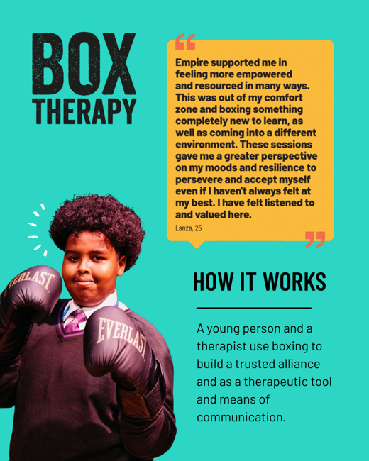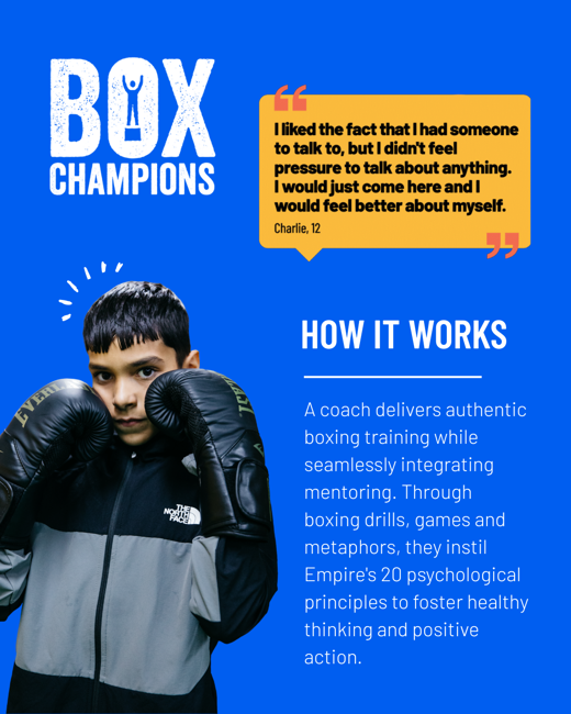 Through a combination of non-contact boxing with psychologically informed support, our coaches create a space where young people can challenge themselves physically while developing the mindset and emotional tools to navigate life beyond the gym. Using drills, games and powerful metaphors, we embed Empire’s psychological principles into every session, building healthier thinking, stronger decision-making and positive action.