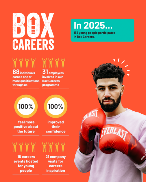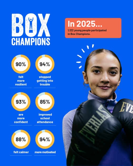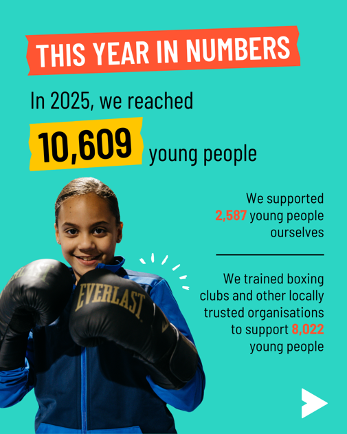 We rose to the challenge. By the end of 2025 we had reached 10,609 people. We supported 2,587 young people ourselves and we have trained boxing clubs and other locally trusted organisations to support 8,022 young people.